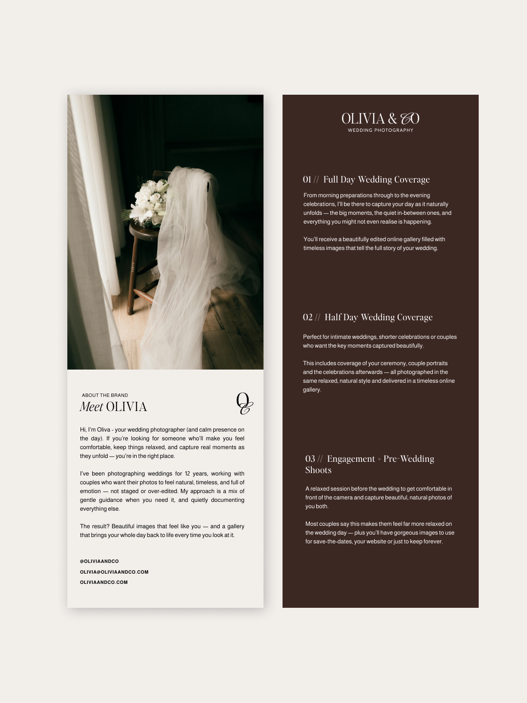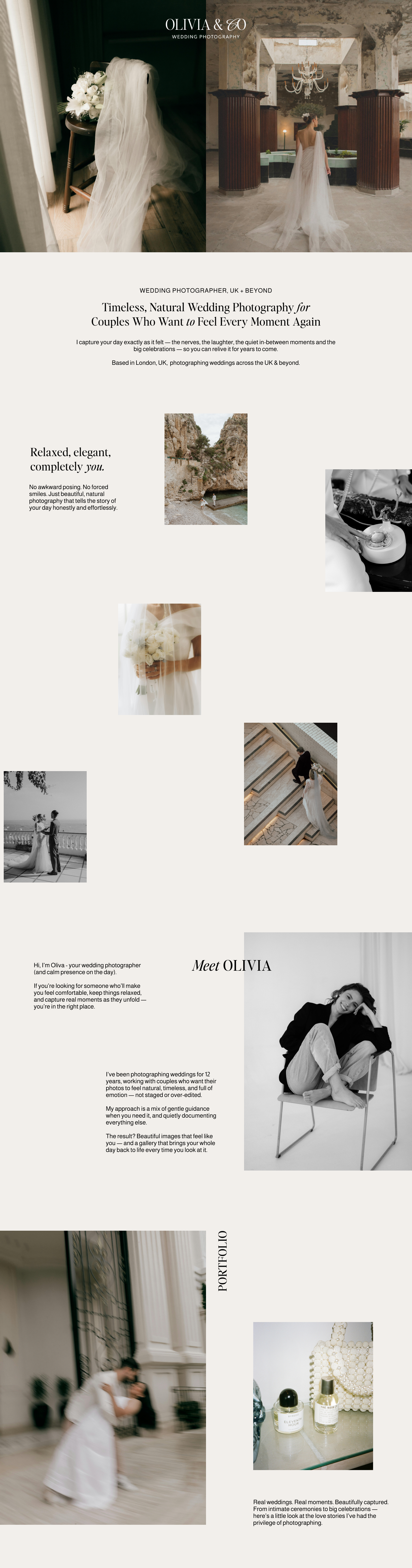 Olivia & Co. is a luxury wedding photography brand specialising in natural, timeless imagery for modern couples who want their day captured beautifully - without awkward posing or forced moments. The brand is built around calm, trust and elegance. Every touchpoint in their business is designed to feel relaxed and intentional, allowing couples to instantly feel at ease with their photographer while also recognising the high level of professionalism and experience behind the business.